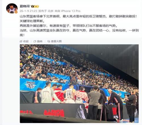 当山东男篮客场凭借珀赛尔绝杀北京队之后,夏晓司老师是十分激动的,他在社交平台写道:“山东男篮客场拿下北京首钢,最大亮点是年轻的后卫谢智杰,敢打敢拼敢突敢投!关键球处理果断。再就是外援珀塞尔,有速度有篮子,带领球队打出不服客场的气势。当然,山东高速男篮全队赢在防守,赢在气势,赢在团结一心,没有包袱,一拼到底! ”