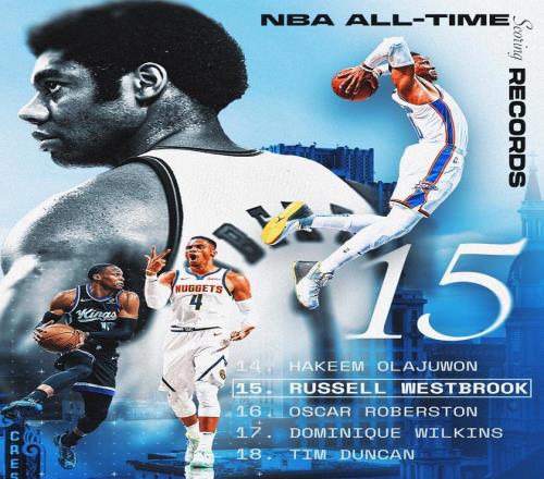 威少拿下17分后,生涯总得分来到26711分,成功超越大O升至NBA历史得分排行榜第15位,也成为NBA历史控卫得分王。