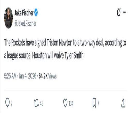 根据记者Jake Fischer报道,火箭队完成一签一裁,与后卫特里斯滕-牛顿签下双向合同,并为其裁掉前锋泰勒-史密斯腾出位置。