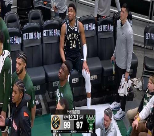 保护了自己全场,结果最后时候受伤,字母哥非常沮丧,默默就走回了更衣室。结果往更衣室走的时候,突然听到场上在欢呼,他又走回替补席坐在板凳席上看球。但是可以看到字母哥非常难受,捂着自己的脸很痛苦。