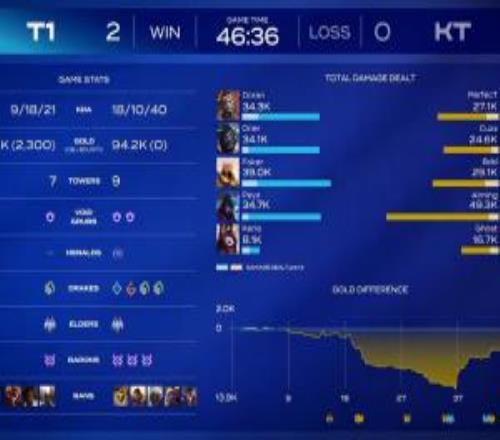 电竞体育01月23报道 T1 2:0 KT,赛后数据面板显示T1在落后13.9k经济差的情况下最终翻盘比赛。