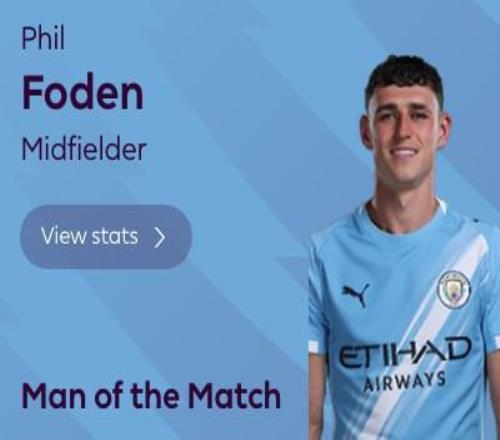 最终经过英超官网球迷投票,福登当选全场最佳球员。