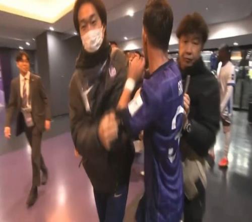 球场不是对手,场下反而我们不怵他们。这场比赛的中场休息时间,在球员通道里双方队员突然发生了一次冲突。原来当双方球员走回更衣室的时候,对方外援阿尔斯兰走着走着,猛然回头往回找。当他看到高天意的时候,一把揪住后者的胳膊说着什么。高天意没有说话,就这样互相纠缠着(上图)。