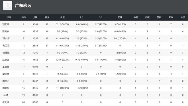 此役广东队有5人上双,谈仁凯12中7+罚球7中3拿19分5篮板7助攻;吾米提江9中5拿16分5助攻;徐小华10中4拿12分6助攻;刘卫霖19中8拿21分7篮板;