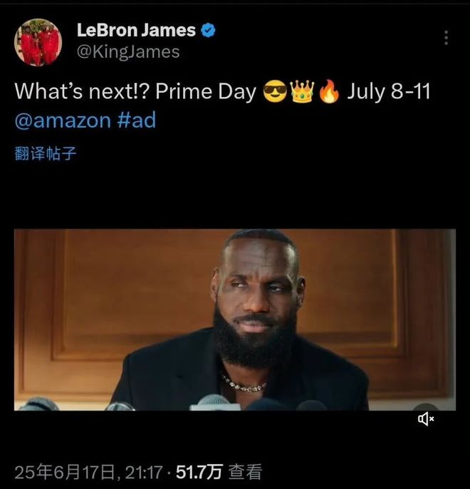 不过后来证明,这只是詹姆斯与亚马逊的会员日广告,巧合的是,明天(当地时间,也是詹姆斯宣布的决定二时间)恰好是亚马逊的会员日。
