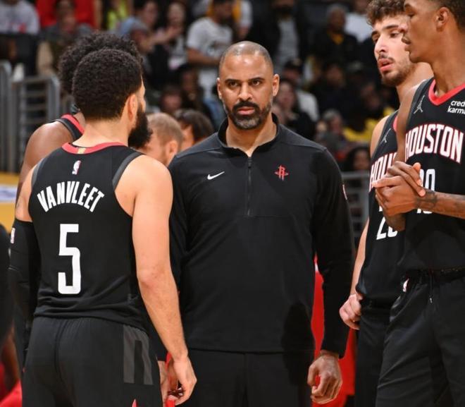 不过本场比赛在火箭队首发五虎之外,乌度卡教练还主动变阵。在比赛的某个时间点,他使用了一套所谓的“五高阵容”,也就是说5位身材非常高的球员在一起搭档,同时出现在了比赛场上,这让亚特兰大老鹰队感觉非常不适应。这套阵容是这样的:控卫是高大的阿门·汤普森,伊森来到了得分后卫的位置上,小前锋是小史密斯,大前锋和中锋是申京和亚当斯。
