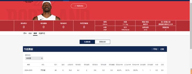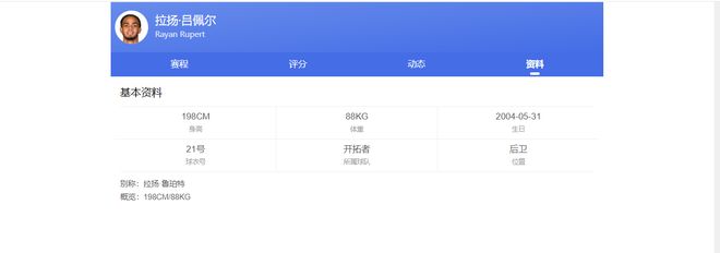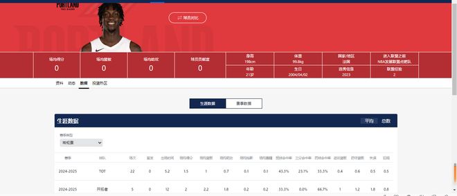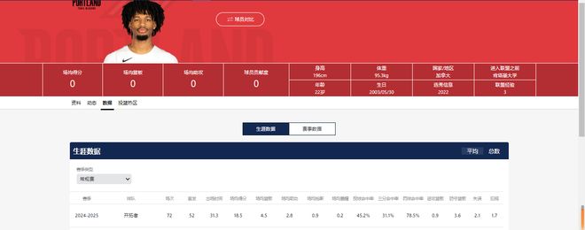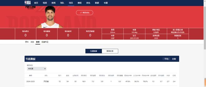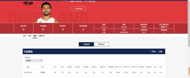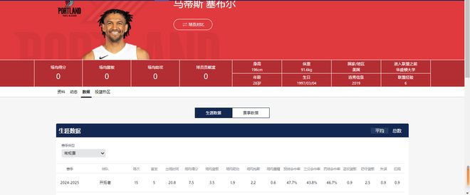 以se列国籍,在场司职前锋,新赛季将是他效力开拓者的第二个赛季。上赛季,他累计出场72次,场均数据为16.9分7.3篮板3.9助攻,队内绝对主力。