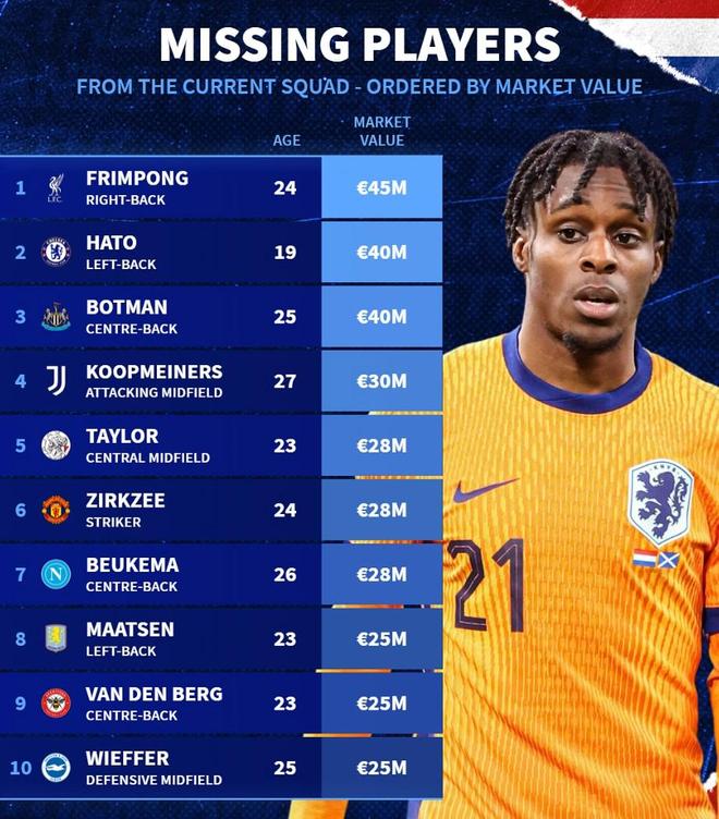 北京时间11月15日,荷兰队在世预赛欧洲区G组倒数第二轮的比赛中客场1-1战平波兰,未能提前晋级美加墨世界杯,与此同时,德转则统计出了此次未能入选橙衣军团大名单身价最高的10位球员,利物浦的弗林蓬领衔,切尔西的哈托、尤文图斯的库普梅纳斯以及曼联的齐尔克泽上榜。